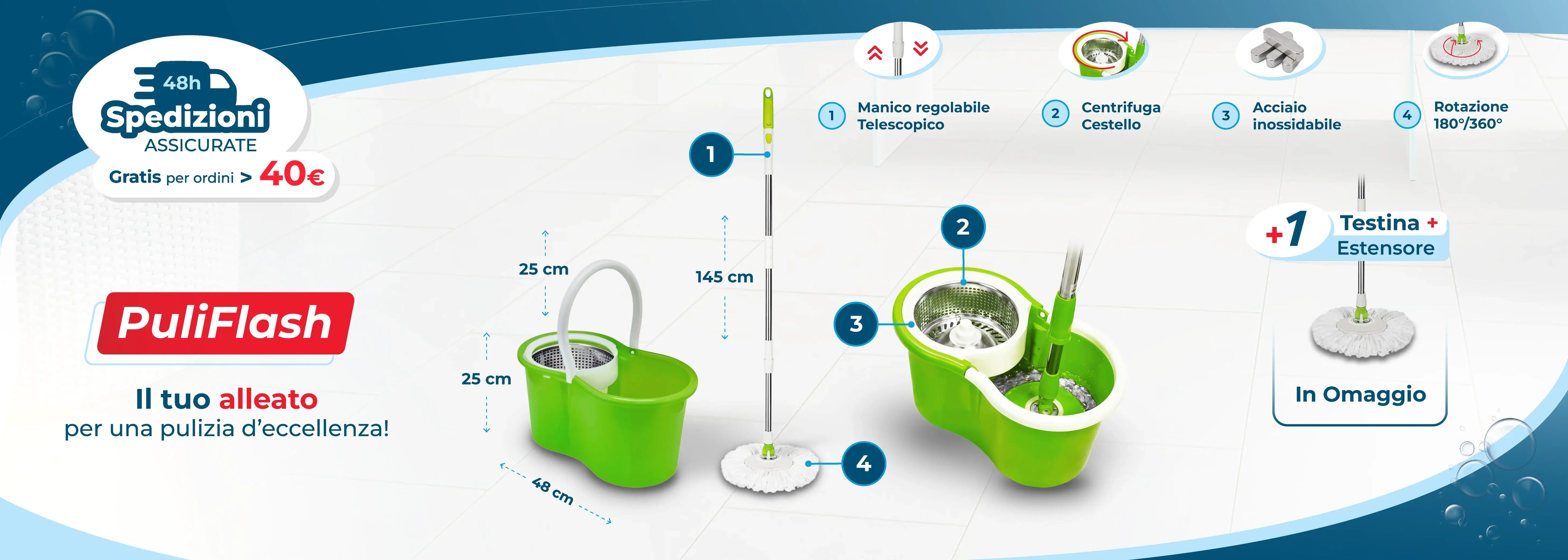 Risparmia tempo e fatica con PuliFlash: il tuo alleato per una pulizia impeccabile, veloce e sostenibile.