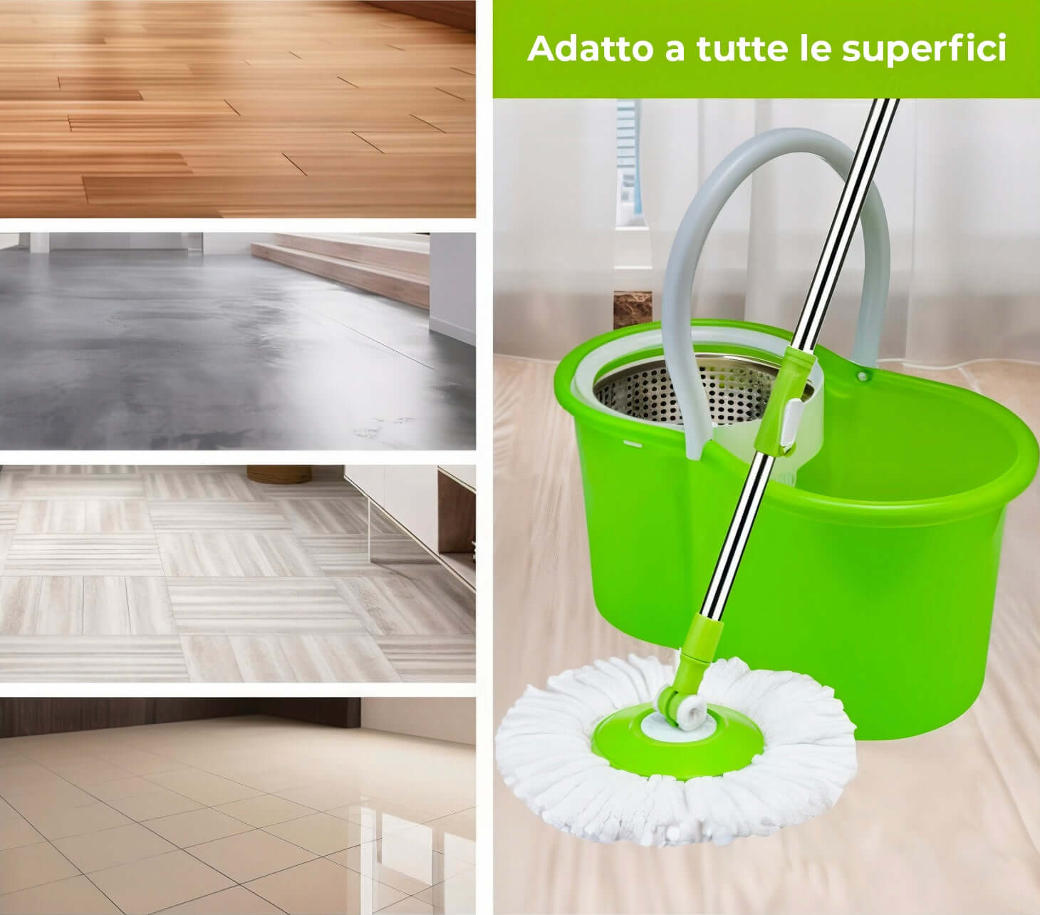 Il design intelligente include un tappo per il deflusso dell'acqua senza sollevare il secchio, consentendo una gestione efficiente. Il panno in microfibra super assorbente non solo si adatta a tutti i tipi di pavimenti, ma può essere utilizzato anche su mobili, piastrelle, muri, vetri e specchi.